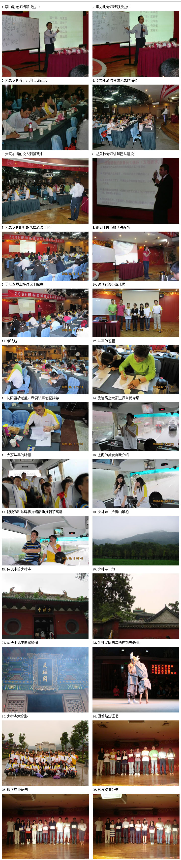 13日清晨,带着对千年古刹---少林寺的向往,大家开始了第二天的旅游活动,绵绵的细雨为大家带来了少林寺欢迎贵宾的最高礼仪---“洗尘”。来自五湖四海的兄弟姐妹们一路上欢歌笑语,饱览中岳庙、嵩阳书院、少林寺的美景。伴随着少林寺的钟声,大家回到酒店盛装参加了搜狗星诚协会为本次活动举办的颁奖晚宴,在一个个由销售明星激情表演的节目中结束了本次快乐的搜狗星诚协会高级销售明星活动之旅!