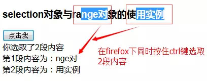 如上代码,当用户选取一段文字后,点击按钮,会显示选取的文字,如下在firefox下效果:
