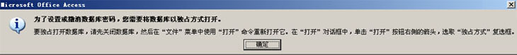 这时候弹出一个提示窗口,它提示要用独占方式打开数据库才能设置或撤销数据库密码。