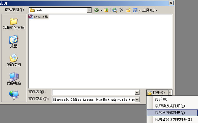 在这个对话框中选择需要打开的数据库,然后将鼠标移动到这个对话框中“打开”按钮右面的向下按钮。在弹出的菜单中选择“以独占方式打开”,并单击这个选项。