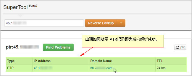检测地址:http://mxtoolbox.com/SuperTool.aspx。检测类型选择 Reverse Lookup或 MX Lookup均可,输入您的IP地址,如果出现下图所示PTR记录,即表示反向解析成功。
