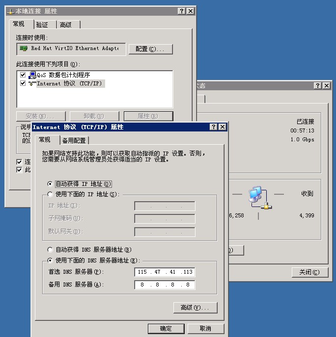 选择“使用下面的DNS服务器地址”--在“首选DNS”中输入您的服务器ip地址,在“备选DNS”中输入“8.8.8.8”,点击“确定”,j就搞定了。