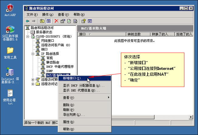 第三步:建立接口。依次双击展开 服务器名(本地)-IP路由选择,找到 NAT/基本防火墙,右键 选择“新增接口”。然后在弹出的属性框里点“公用接口连接到Internet”,点选“在此连接上启用NAT”-确定。