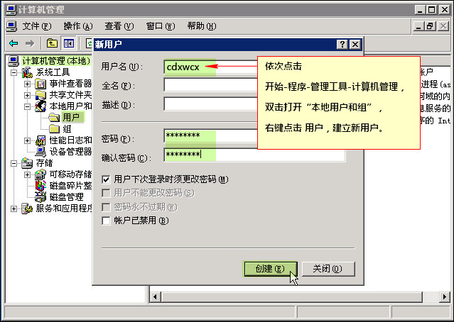 第五步:拨入权限设置。设置远程访问策略,允许指定用户拨入。依次点击 开始-程序-管理工具-计算机管理,弹出“计算机管理”对话框。选择“本地用户和组”,右击 用户-新用户。