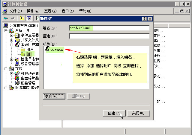 在左侧树形目录中右击 组-新建组,填入 组名,点击“添加”,在弹出的“选择用户”对话框中,点击 高级-立即查找,选择刚才建立的用户(图例为henghost),把用户加入刚才建立的组(图例为sondercloud)。