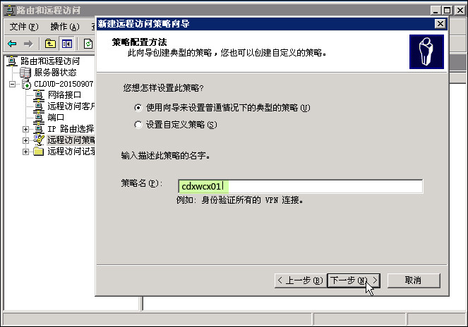 设置远程访问策略:返回“路由和远程访问”窗口,右击“远程访问策略”,选择 新建远程访问策略-下一步,填入方便记忆的“策略名”-下一步,选择“VPN”选项,下一步 - 添加,把刚才新建的组加入到这里,下一步-下一步-下一步-完成。以后新的用户需要VPN服务,只要为该用户新建一个帐号,并加入刚才新建的组即可。