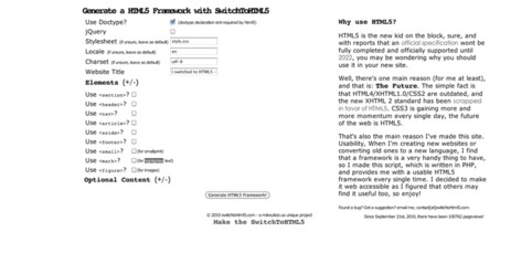 Switch To HTML5可以帮助你快速的生成一个基于HTML 5的模板。如果你准备创建一个新的项目,建议你先访问这个网站,从中可以获得免费的HTML 5模板。