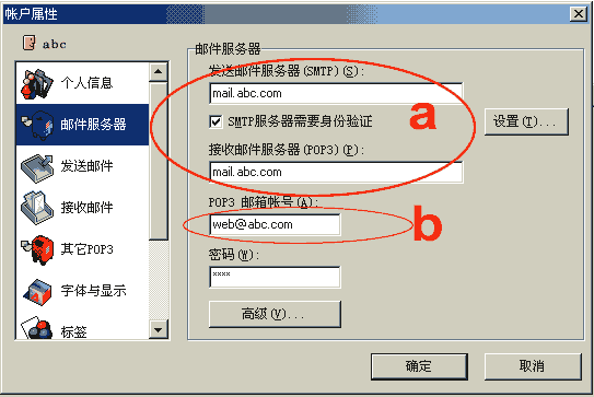 1、在“a”处的“POP3服务器”和“SMTP服务器”均填写“mail.abc.com”;