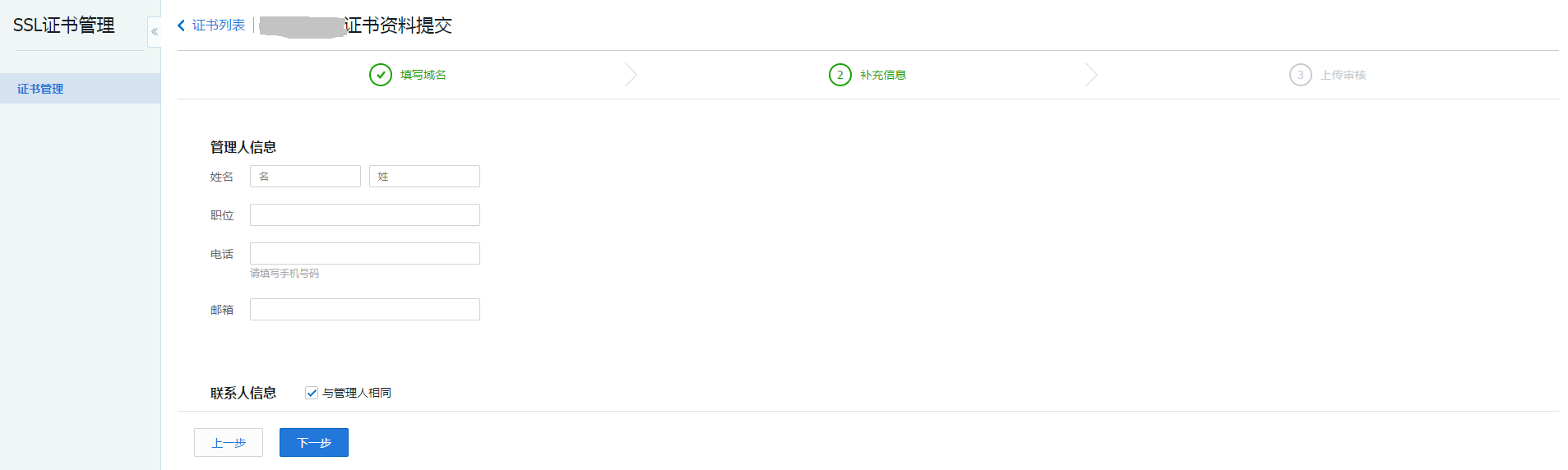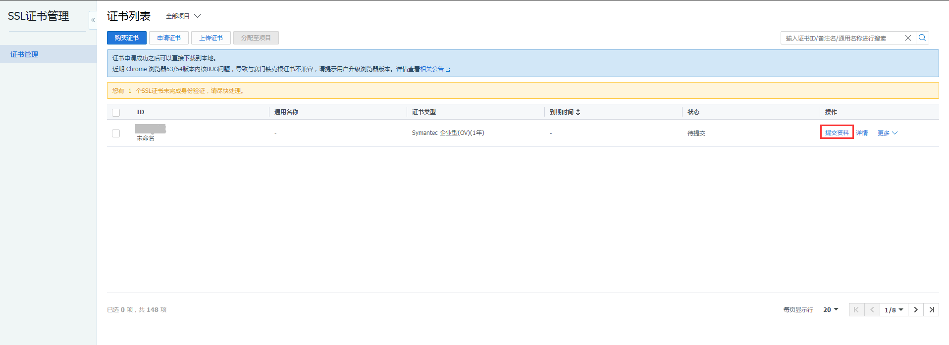 购买到的证书会显示在证书管理列表中,点击“提交资料”