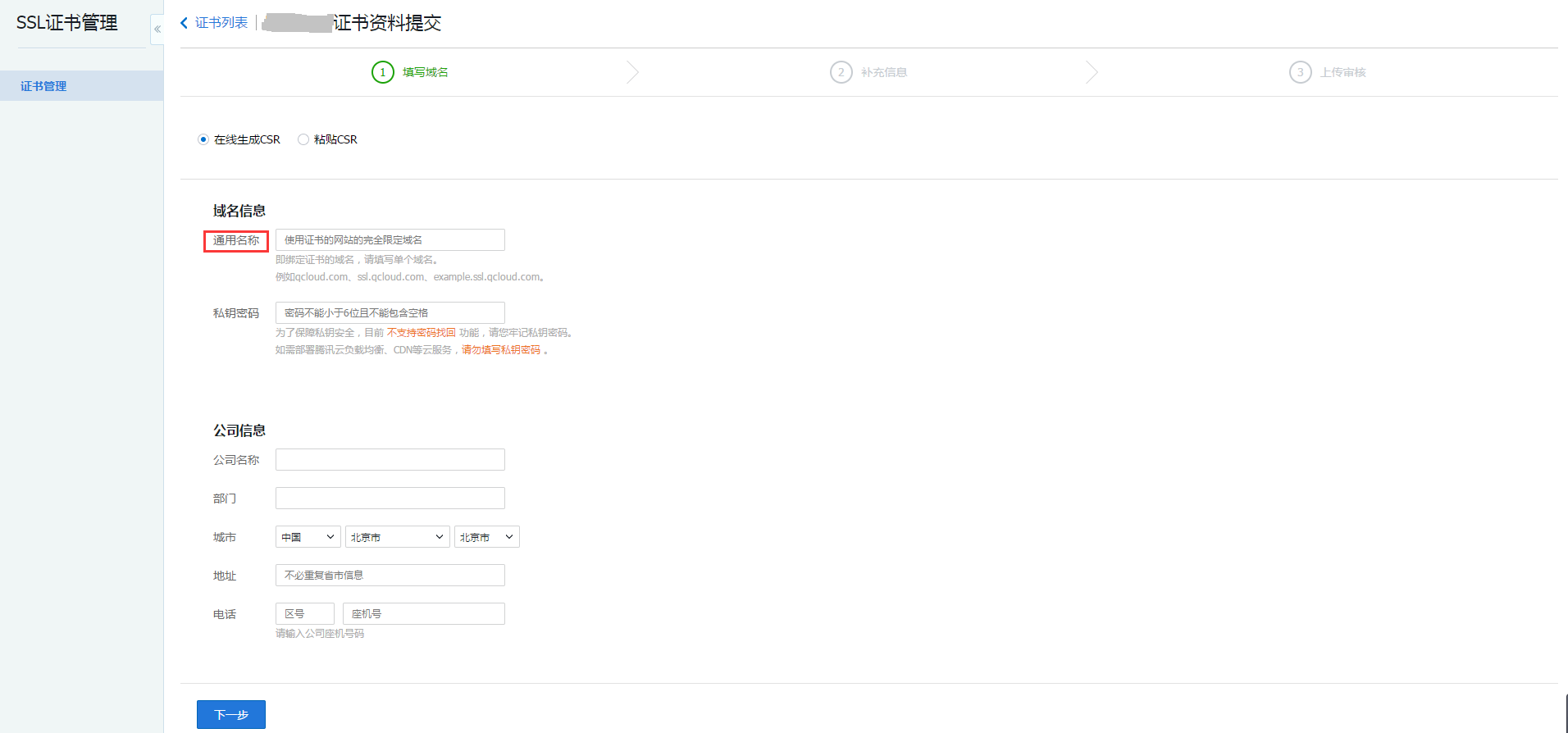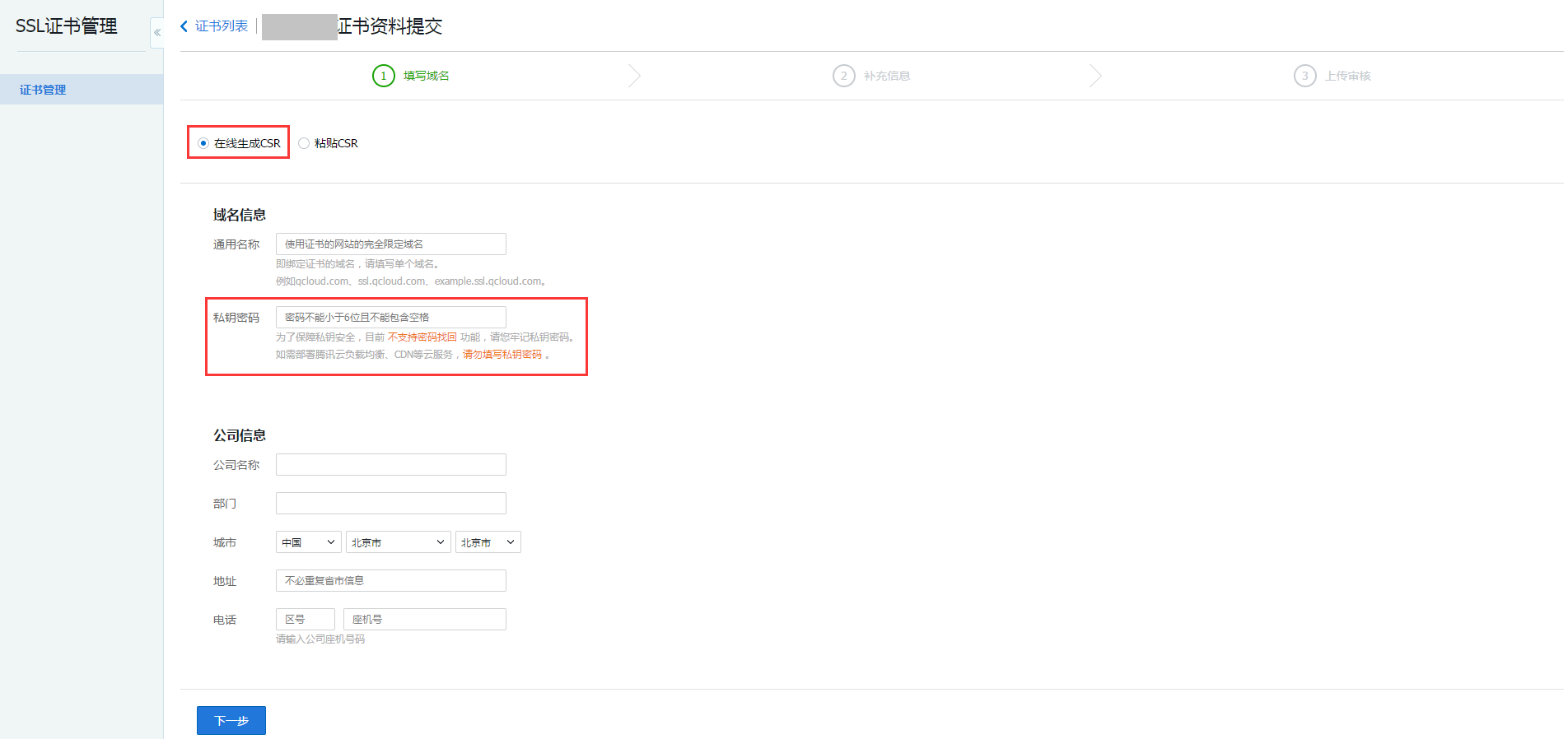 CSR生成分两种方式,可任选一种进行CSR生成 在线生成CSR,可选填私钥密码(填写后不可更改)