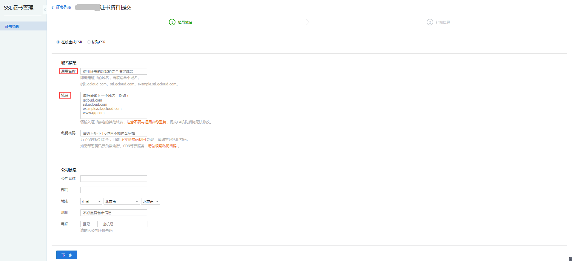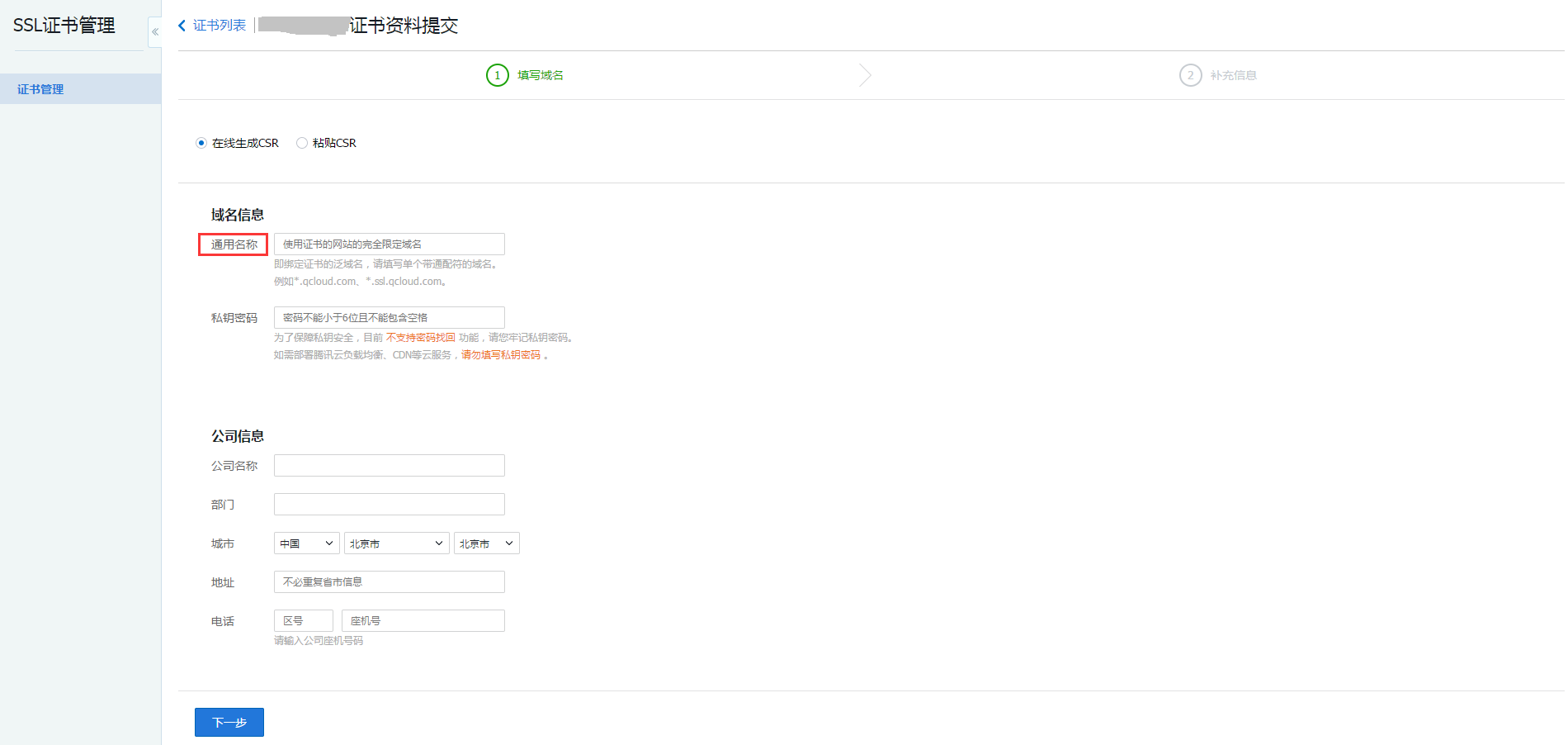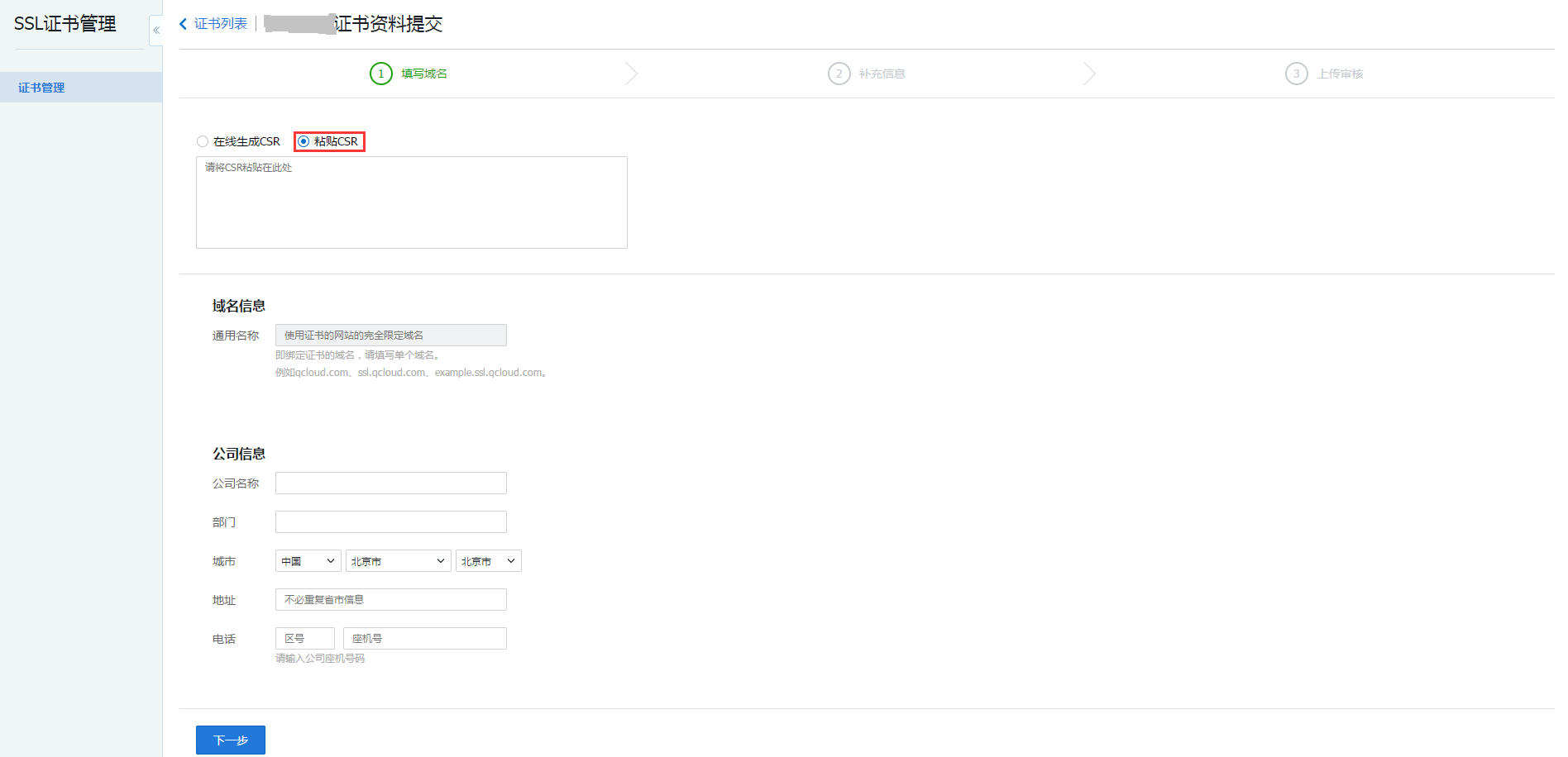 注:用户在选择粘贴CSR时,通用名称会从CSR文件中自动读取,不可更改。