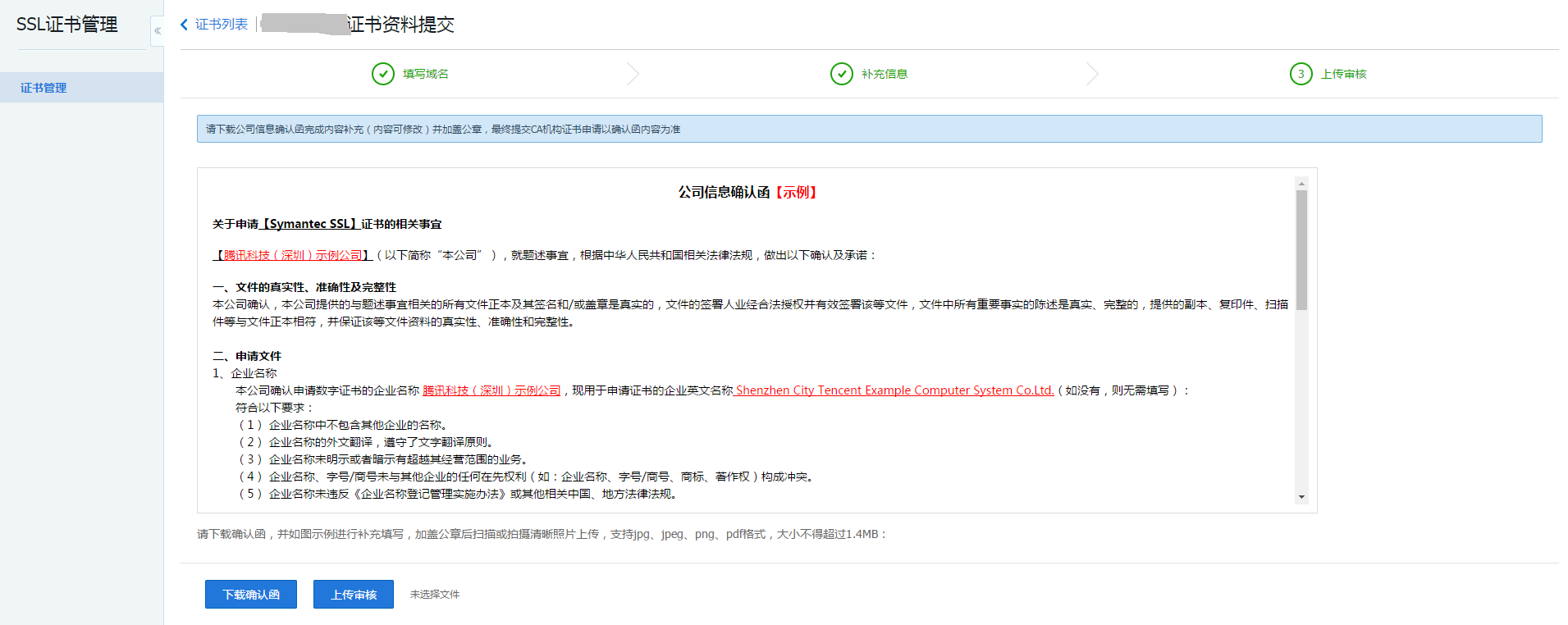 CSR提交后,用户还需提交确认函。点击【下载确认函】,进行确认函信息补充填写。
