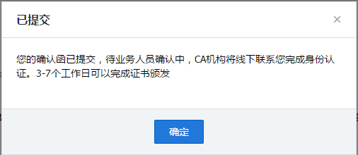 提交后,进行弹窗提示,等待线下亚洲诚信工作人员与CA机对提交材料进行确认与审核