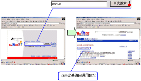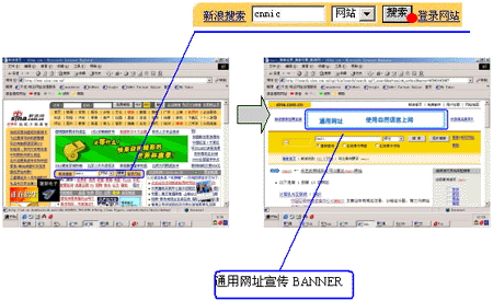 在新浪的网站搜索中输入通用网址,点击"搜索"按钮,在结果页面出现通用网址宣传BANNER,点击后可以进入相关网站。(确实是"综合"搜索,而不是"网站"搜索)