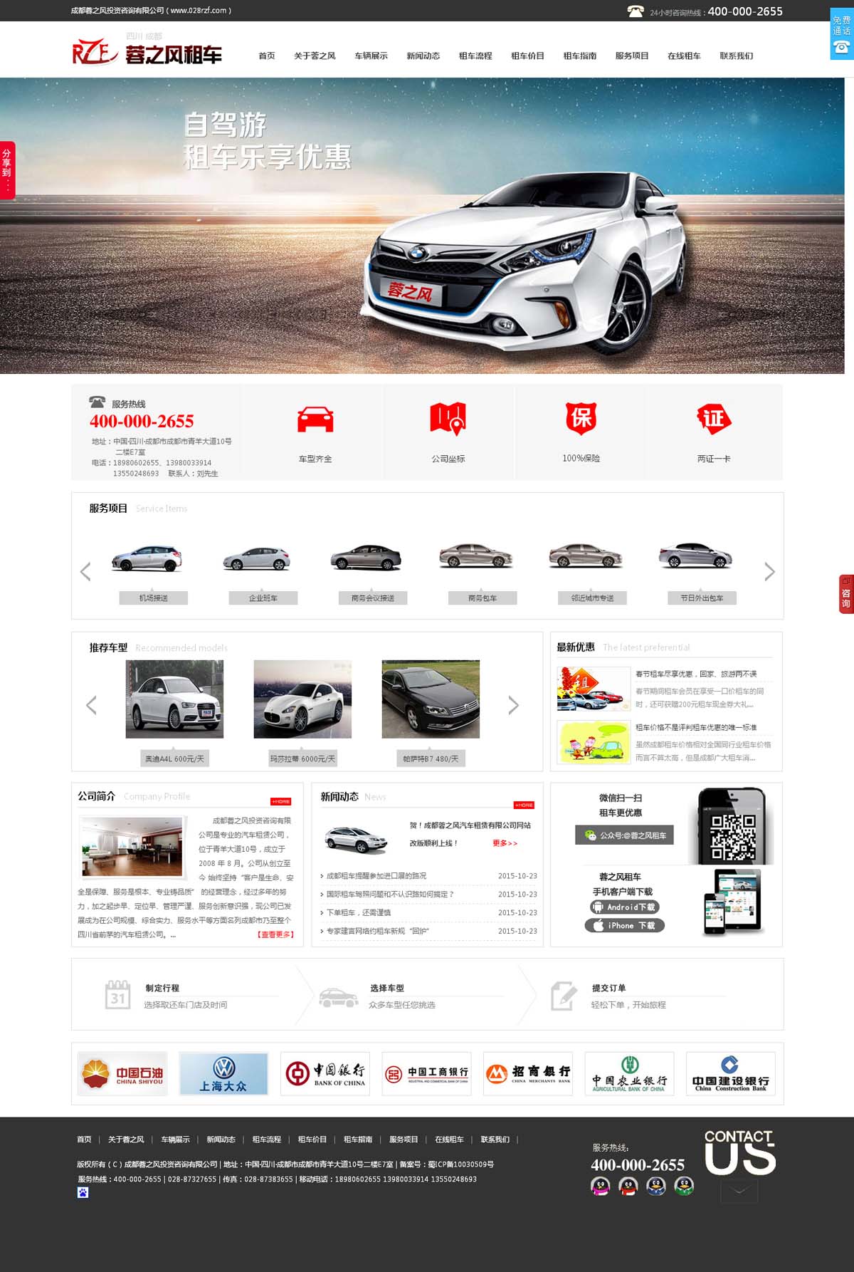 成都蓉之风投资咨询有限公司是专业的汽车租赁公司,位于青羊大道10号,成立于 2008 年 8 月。公司从创立至今 始终坚持“客户是生命、安全是保障、服务是根本、专业铸品质”的经营理念,经过多年的努力,加之起步早、定位早、管理严谨、服务创新意识强,现公司已发展成为在公司规模、综合实力、服务水平等方面名列成都市乃至整个四川省前茅的汽车租赁公司。