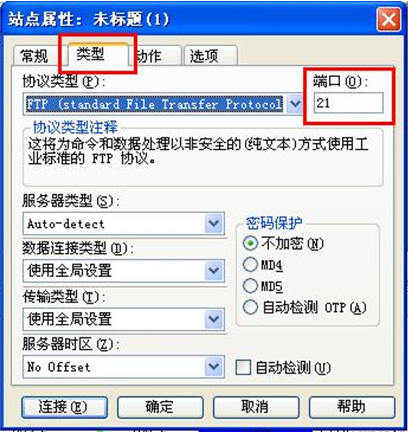 3.点击“类型”,端口设置为“21”。
