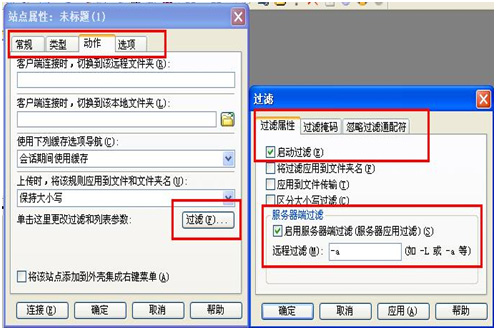 4. 如果需要显示隐藏的文件,请点击“动作”选项卡——“过滤”——勾选“启动过滤”——勾选“启用服务器端过滤”——“远程过滤”中填写“-a”,点击确定。