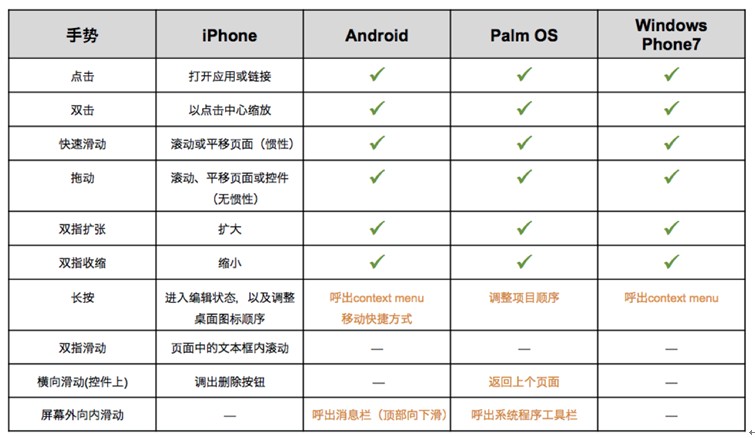 移动触屏的产生,同时也带来了各种手势的配搭。这些手势的应用,相比于键盘、鼠标,能更加快速做出响应,并且降低学习成本,更加直观地进行人机交流。但触摸相比鼠标,却无法达到高度的精准,也无法出现像网页中的鼠标hover、悬停等的效果。东西方人的指尖触碰面积略有不同,但通常,它们合适的点击区域是在44-44px的范围里。