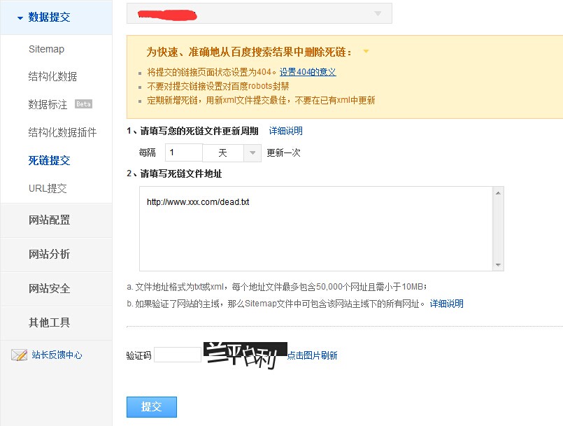 这两步是以前很常见的方法,不过现在百度站长平台已经提供了专用的死链提交功能,我们只需要把网站中存在的死链接地址逐行写在一个TXT文档中,把TXT文档放在网站服务器上,并提交给百度就可以加速百度对这些死链接的删除效率了。