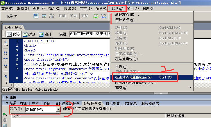 打开Dreamweaver 网页开发工具菜单栏中 站点 > 检查站点范围的链接 在dw软件下方就是检查了。检查了完后显示这就可以按分类查看:断掉的链接、外部链接、孤立文件。